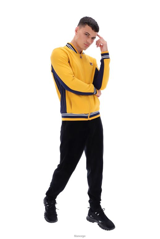glidelås I Den Klassiske Gylne Fila Settanta Treningsjakken For å Holde Seg Varm Og Trendy Denne Høsten. Med Marine Aksenter Med Hvit Trim, Vil Du Være Sikker På å Skille Seg Ut Uansett Vær. Kommer Merket Med Fila F-box-logoen Og Glidelås I Full Lengde. Denne Retro Treningsjakken Er Bygget For å Vare Med Ribbestrikkede Mansjetter, Midje Og Krage.